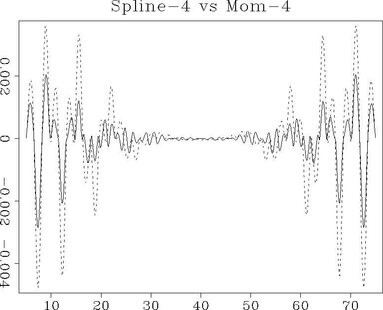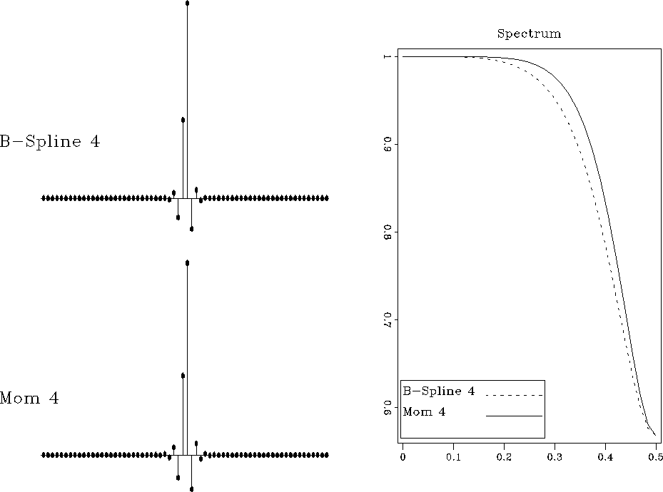 Figures [*] and [*] compare the test interpolation errors and discrete responses of methods based on the B-spline function $\beta^3(x)$ and the lower smoothness function $\mu^3(x)$. The latter method has a slight but visible performance advantage and a slightly wider discrete spectrum.