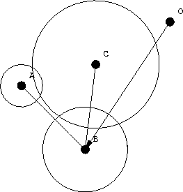 Figure 4 Cusp points. A, B and C are the three points on the current wavefront. Point O is the previous point on the ray going through B. The angle CBA is smaller than the angle OBA, and therefore B is a cusp point. If the angle CBA is closer to 90 degrees than the angle OBA, then C is merged with B; otherwise, A is merged with B. The three-point scheme becomes a two-point scheme without any change in the program. | ![]() |