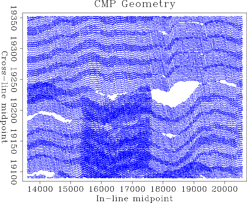 Following Biondi's reproducible example, I use a potion of the Conoco North Sea dataset with offsets, windowed in the range from 400 to 600 m. The geometry of the CMP locations of the input traces is illustrated in Figure 10. The fold distribution, shown as a map view in Figure 11 and as a histogram in Figure 12 is fairly dense overall, but has noticeable holes (empty bins). The regions of zero fold make the inverse interpolation problem underconstrained and suggest an application of a regularized optimization scheme.