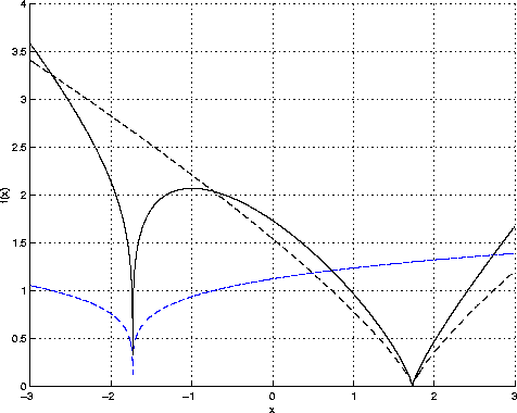 The graph of the function defined in Equation (1) used to generate Muir's iteration for the square root (solid line). The dashed lines are the plot of the two factors in the equation  .