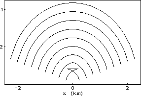 Summation paths of prestack residual migration for a series of depth diffractors. Residual slowness v/vd is 1.2; offset h is 1 km. This figure reproduces Etgen's Figure 2.4.