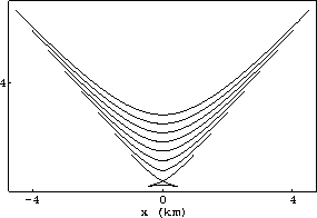 The direct solution of equation (32) is nontrivial. A simpler way to obtain this solution is to decompose residual NMO+DMO into three steps and to evaluate their contributions separately. Let the initial data be the zero-offset reflection event $\tau_0(x_0)$. The first step of the residual NMO+DMO is the inverse DMO operator. One can evaluate the effect of this operator by means of the offset continuation concept Fomel (1995). According to this concept, each point of the input traveltime curve $\tau_0(x_0)$travels with the change of the offset from zero to h along a special trajectory, which I call a time ray. Time rays are parabolic curves of the form