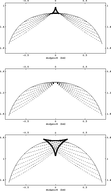 The last step of the cascade of inverse DMO, residual NMO, and DMO is illustrated in Figure 5. The three plots in the figure show the offset continuation to zero offset of the inverse DMO impulse response shifted by the residual NMO operator. The middle plot corresponds to zero NMO shift, for which the DMO step collapses the wavefront back to a point. Both positive (top plot) and negative (bottom plot) NMO shifts result in the formation of the specific triangular impulse response of the residual NMO+DMO operator. As noticed by Etgen 1990, the size of the ``triangle'' operators dramatically decreases with the time increase. For large times (pseudo-depths) of the initial impulses, the operator collapses to a point corresponding to the pure NMO shift. This fact agrees with the conclusions of the preceding subsection about the comparative importance of the residual DMO term. It is illustrated in Figure 6 with the theoretical impulse response curves, and in Figure 7 with the result of an actual cascade of the inverse DMO, residual NMO, and DMO operators.