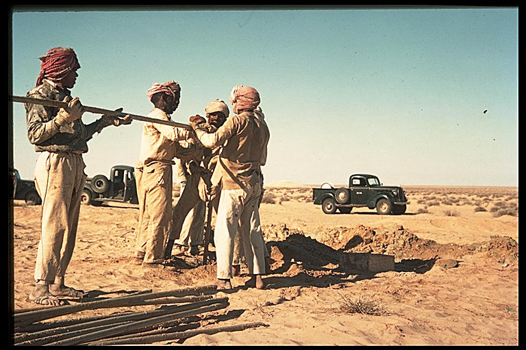 Loading the shot hole) (Hooking loading poles together to tamp the charge down the hole to the correct depth)