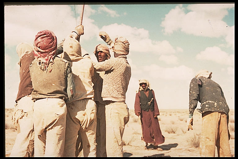 Loading the shot hole (Hooking loading poles together to tamp the charge down the hole to the correct depth)