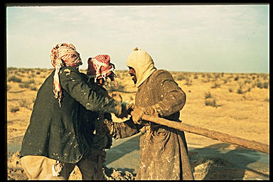 Loading the shot hole (Hooking loading poles together to tamp the charge down the hole to the correct depth)
