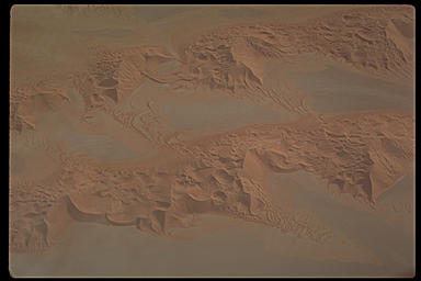Flying over the Rub al Khali [the empty quarter] at 10,000' (Sabkah's are the barren areas between dunes.)