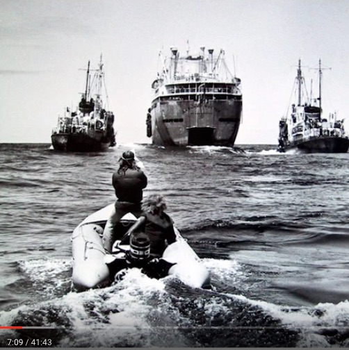 His video shows from international media this picture of him running a small inflatable boat into the Soviet whaling fleet.