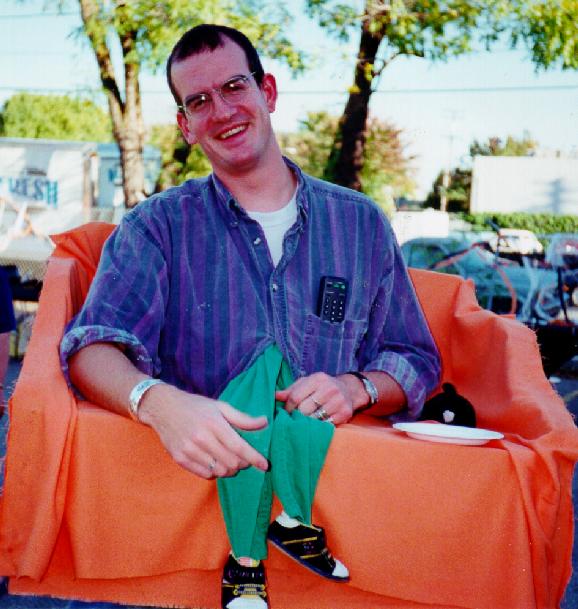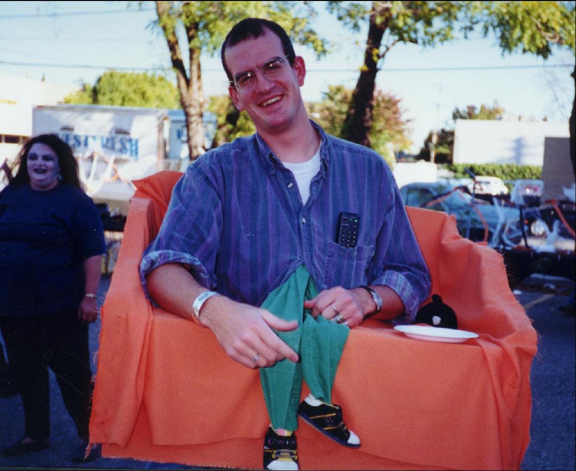 The picture (mother's favorite) shows Jos, 23, at a WebTV Halloween party. His costume is a "couch", a joke on his bringing an orange couch to work. His boss criticised it, but she often sat on it.