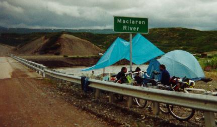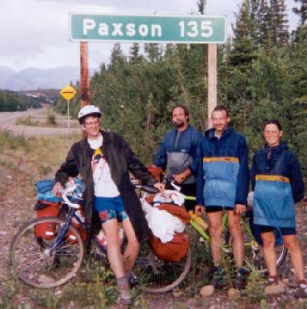 Marrianne: As evening drew nigh, we got off our bikes and looked over the tundra. Ralf said this looked like a great spot to camp. Jeremy looked incredulous. "Where?" he asked. We slept wonderfully well that night on the millions of tiny fragrent flowers of Labrador Tea. Ralf: The other man with us was a lawyer. Our English wasn't very good at that time so we didn't know what they were debating. We could tell though that despite his young age, Jeremy "won" many of those discussions. [We never heard from the third rider, Don Logan, and learn now we never will., backup. ] |
