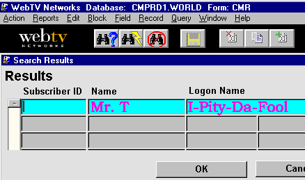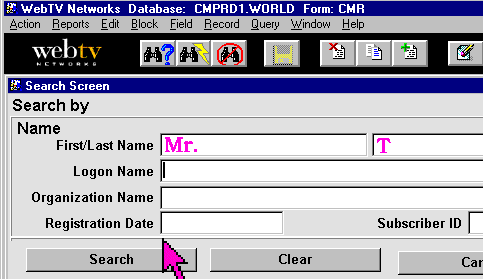 | Perlman found an unoccupied computer (Camilo was inexplicably away from his desk), and sat down at the CMR search screen. There was only one chance for the future of WebTV. Only one. |