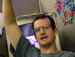 Not making the mistake he made on his earlier movies, Jos got signed releases from all his actors that would allow him full distribution rights. One of the reasons for making this video now, was that he needed a movie to demonstrate "pop-up" technology (balloon overlays). He got permission to shoot Rear Cubicle at WebTV. The justification he offered (and he felt) was that he needed a movie that he had the all the required rights to experiment publicly with WebTV's potential technologies. This movie had no financial underwriting. They did it for the joy of it.