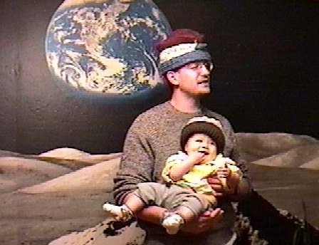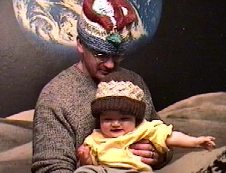 Jos in December 1998 with his niece, Hanna. Clips from a handicam video. Jos is wearing his angry teapot toessel. We don't recognize the style on Hanna, nor do we know where it is today.