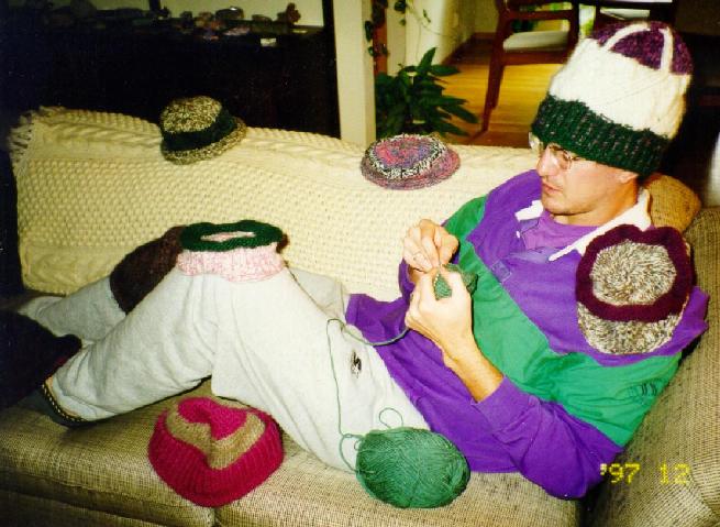 When we returned to Claremont, Jos became intent on forming a knitting circle. He really wanted me there, but I quickly became wrapped up in other things and, to be honest, while I enjoyed knitting, I never shared Jos' passion. Jos did make the knitting circle happen, knitting with those who knew, introducing those who didn't to his avenue of the artistic world. Jos' prolific hat creation continued.