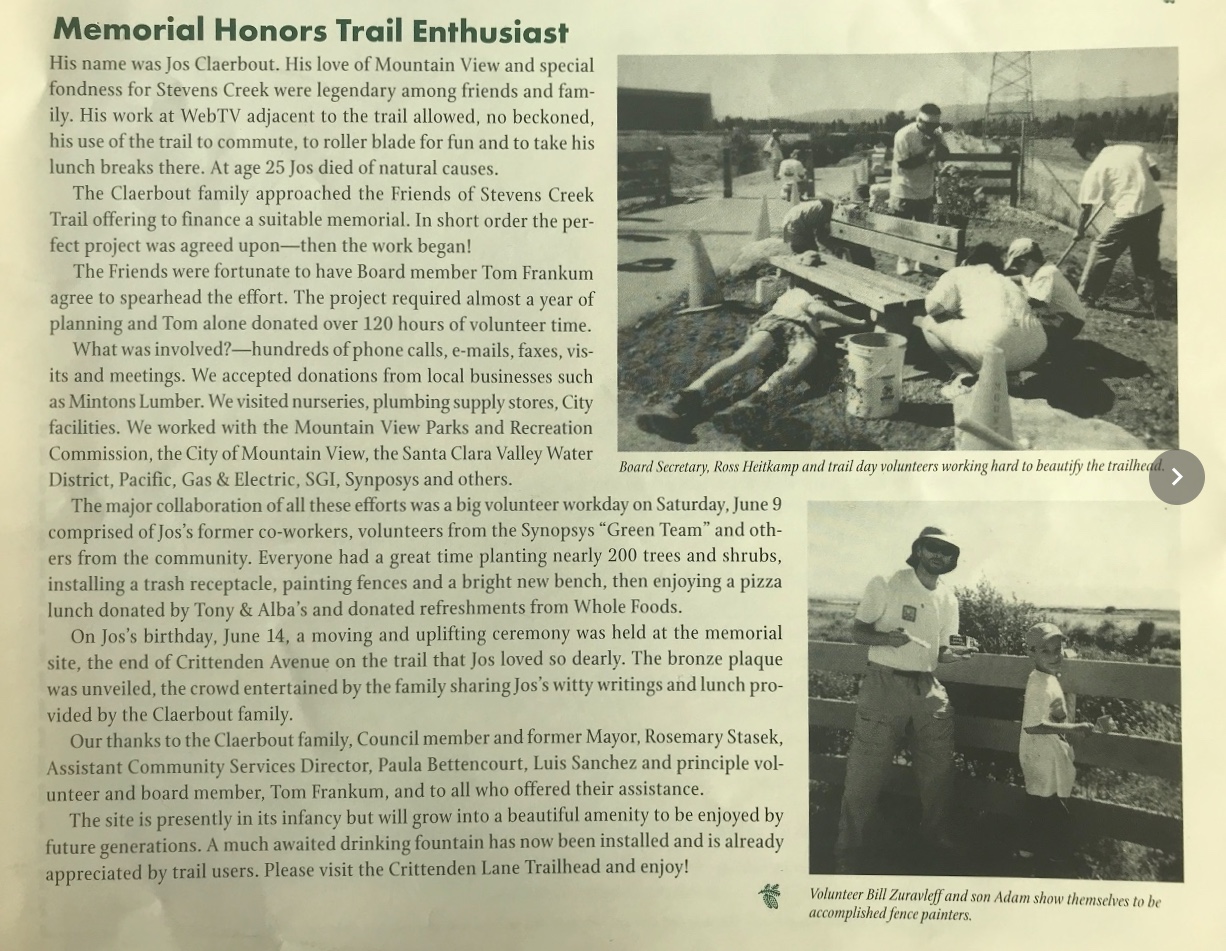 Friends of the Stevens Creek Trail (www.stevenscreektrail.org) in cooperation with the City of Mountain View CA proposed a project for a landscaping and habitat enhancement on the Stevens Creek Trail at the Crittenden Lane Trailhead. This trailhead is near where Jos Claerbout often took his lunch walks from WebTV (15-20 minute walk from the Toessel Tree).