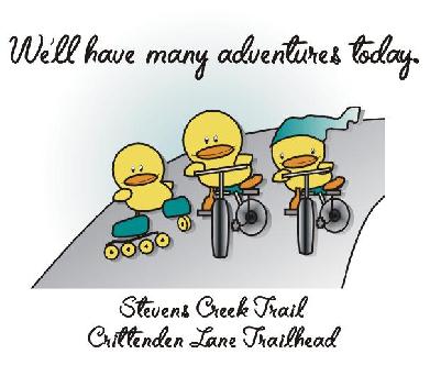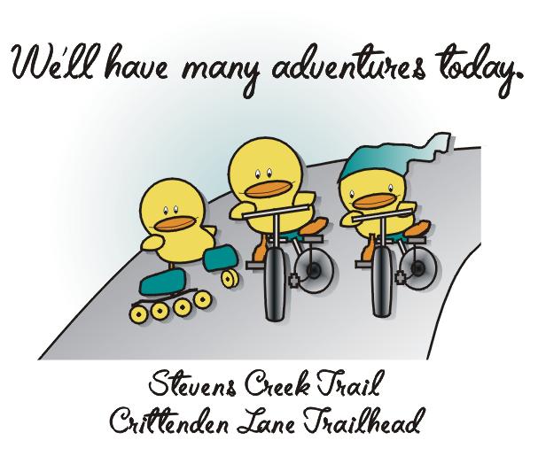 When Dad saw the site he was struck by the similarity of the families biking along the path, and duck families in the creek. Jos's friend Lisa Lee was able to link both themes in a graphic which we used both on the plaque and on a tee shirt (below). You might notice that one of the little duckies is wearing a toessel.