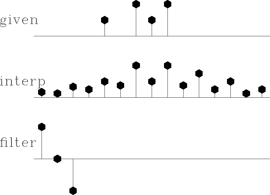 Figure 7 Top is the same as in Figures 3 to 6. Middle is interpolated. Bottom shows the filter (1,0,-1), which comes from the coefficients of | ![]() |
