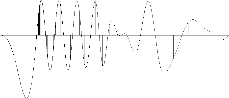 To show an example where the result is clearly a theoretical answer, I prepared another figure with the simpler filter (1,-1). When we minimize energy in the first derivative of the waveform, the residual distributes itself uniformly between data points so the solution there is a straight line. Theoretically it should be a straight line because a straight line has a vanishing second derivative, and that condition arises by differentiating by ,the minimized quadratic form , and getting .(By this logic, the curves between data points in Figure 13 must be cubics.) The (1,-1) result is shown in Figure 14.