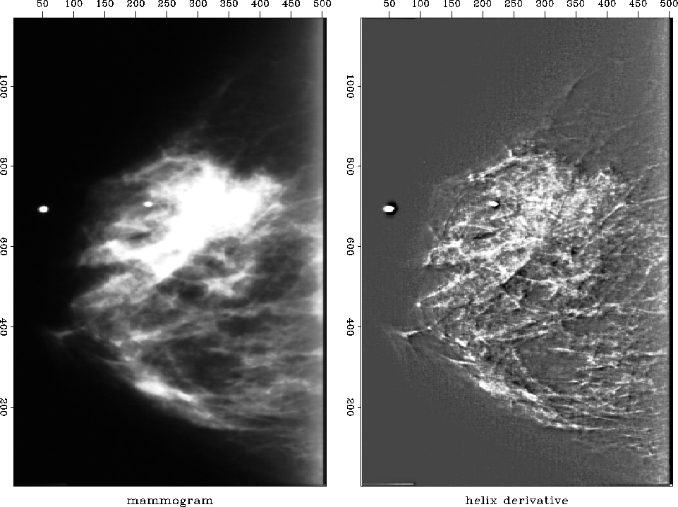 A final word about the doctor. As she was about to leave my office she suddenly asked whether I had scratched one of her X-rays. We were looking at the helix derivative and it did seem to show a big scratch. What should have been a line was broken into a string of dots. I apologized in advance and handed her the original film negatives which she proceeded to inspect. ``Oh,'' she said, ``Bad news. There are calcification nodules along the ducts.'' So the scratch was not a scratch, but an important detail that had not been noticed on the original X-ray.