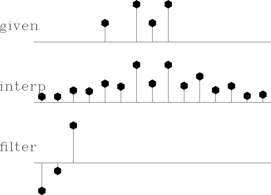 Figure 22 Top is known data. Middle includes the interpolated values. Bottom is the filter with the leftmost point constrained to be unity and other points chosen to minimize output power. | ![]() |