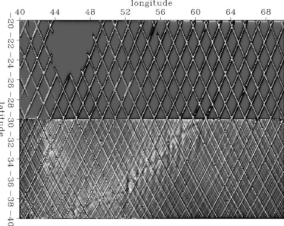The raw data investigated here[*] had a strong north-south tilt which I[*] removed at the outset. Figure [*] gives our first view of altimetry data (ocean height) from southeast of the island of Madagascar.