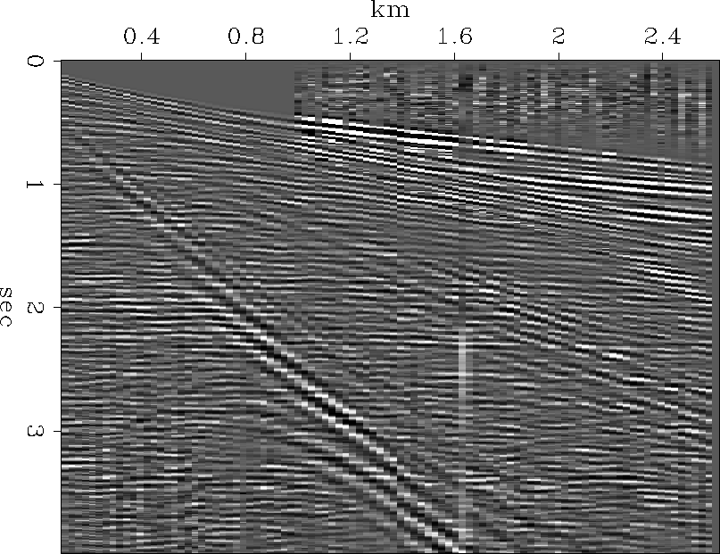 This data is not a zero-offset section. The shot is on the left, and the traces to the right are from geophones at increasing distances from the shot. First draw a line on the figure going through origin and at a slope of the water velocity, 1.5 km/sec. Steeper slopes are slower surface waves. Geological events have lesser slopes. Like the surface of the earth, which varies greatly from place to place, the immediate subsurface which controls the ground roll varies substantially. So although Figure 16 is a nice example, no example can really be typical. In this figure there are two types of ground roll, one at about half of water velocity, and a stronger one at about a quarter of water velocity. The later and stronger one shows an interesting feature known as frequency dispersion. Viewing the data from the side, you should be able to notice that the high frequencies arrive before the low frequencies.