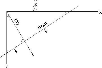 t(x,z) \ \ =\ \ {z\over v }\ \cos\,\theta \ +\ {x \over v }\ \sin \, \theta\end{displaymath} (3)