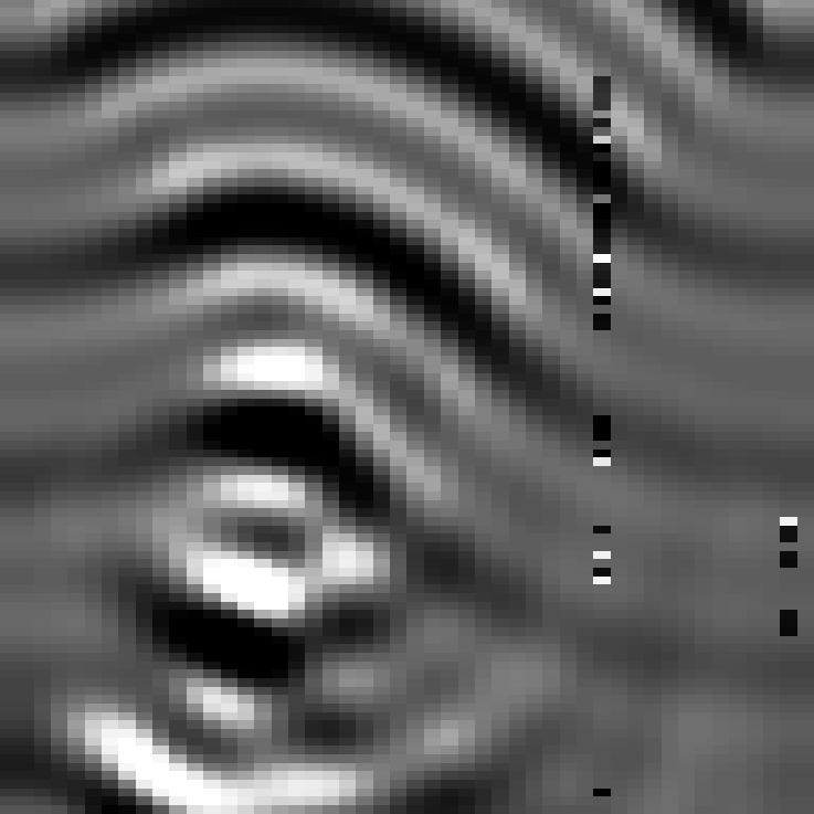 It shows a snapshot of the (x,z)-plane. Collapsing spherical waves enter from the top, go through a focus and then expand again. Notice that the wavefield is small but not zero in the region of geometrical shadow. In the shadow region you see waves that appear to be circles emanating from point sources at the top corners. Notice that the amplitudes of expanding spherical waves drop off with distance and collapsing spherical waves grow towards the focus. We will study the program that made this figure and see many features of waves and mathematics.