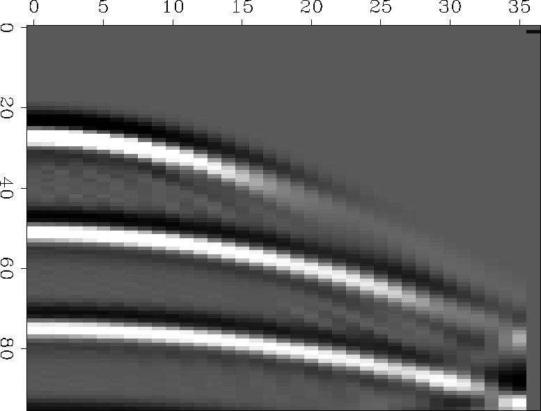 Figure 6 The program time15 was used to create synthetic data from a more complicated model. The three frames depict three depths. The leftmost channel of each frame depicts the depth of the frame. | ![]() |