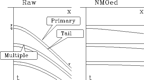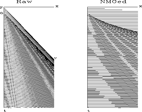 Synthetic data in Figure 7 shows the result of convolution before and after NMO. An event labeled ``G" marks the tail-end of the source signature.