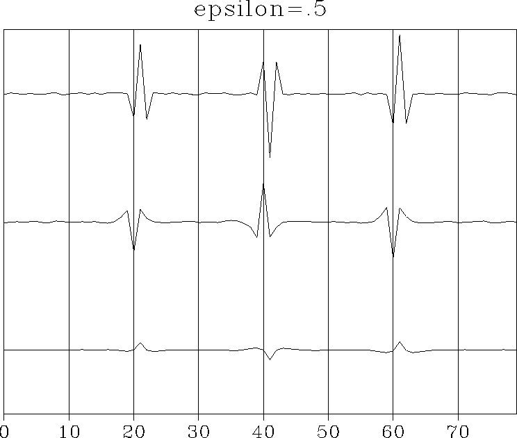 Figure 2 Top is the synthetic data yt. Middle is the deconvolved data xt. Bottom is the noise nt. This choice of | ![]() |
