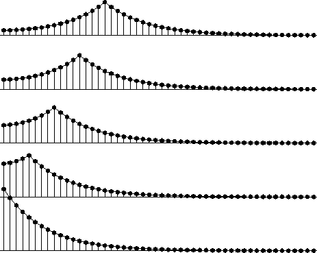 Figure 6 Pulses at various distances from a side boundary smoothed with two-sided leaky integration and zero-slope side conditions. Beyond the last value at the edge is a theoretical value that is the same as the edge value. | ![]() |