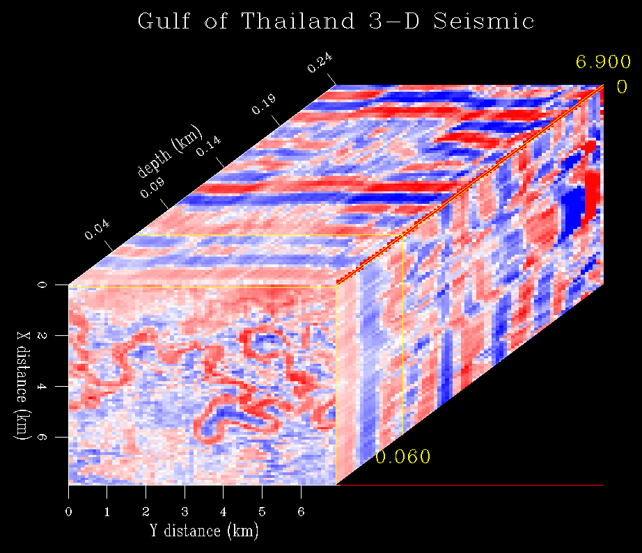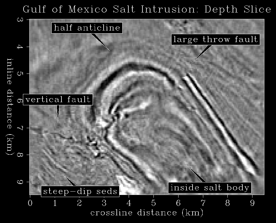 2-D seismology lets us image simple geologic structure and faults. 3-D seismology allows us to see more intricate features such as buried river channel meanders and complex deformation around salt intrusions.