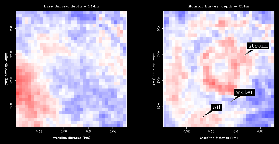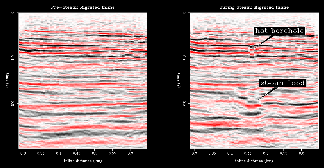 But with 4-D seismology, I can show you fluid flowing in the Earth! You can see before and after views at a steam injection site in both cross-sectional profile and depth-slice map view . Please read my award-winning papers on 4-D seismic monitoring of fluid flow, or a brief description of my research interests for further details.