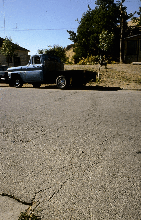 The photo on the right, A2, shows a line of cracks crossing Locust street. This line of cracks is caused by creeping motion along the Calaveras fault; the line of cracks betrays the currently active trace of the fault. Note how the steep Western slope of Vista Park Hill, visible in the background, lines up with the fault. (The strand bounding the East side of the hill is currently inactive.)