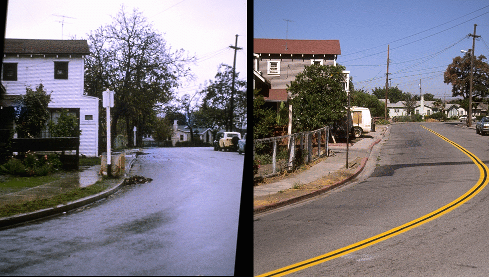Also notice the asphalt patches in the street in the newer photo. Not surprisingly, the pipes in the street break and have to be repaired every few years or so.