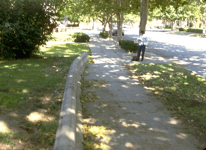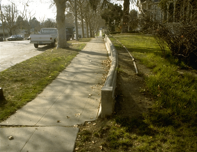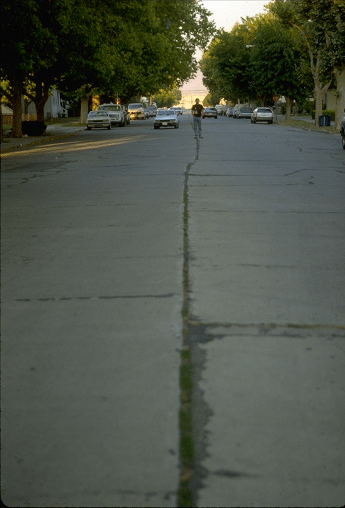 The nearby curb on the North side of 6th street is also being displaced. The photo on top was taken in June 1985, the one on the bottom in February 1991. Is only 5 and a half years' worth of displacement discernible? Hint: use the random patterns in the pebbles to see how much the curb has moved relative to the sidewalk on the other side. (Why I didn't sweep the leaves clear in 1985 before taking the picture I can't understand! And here's a tip I've learned the hard way: take along a fill flash for your camera, in case a parked car is shadowing where you want to photograph.)