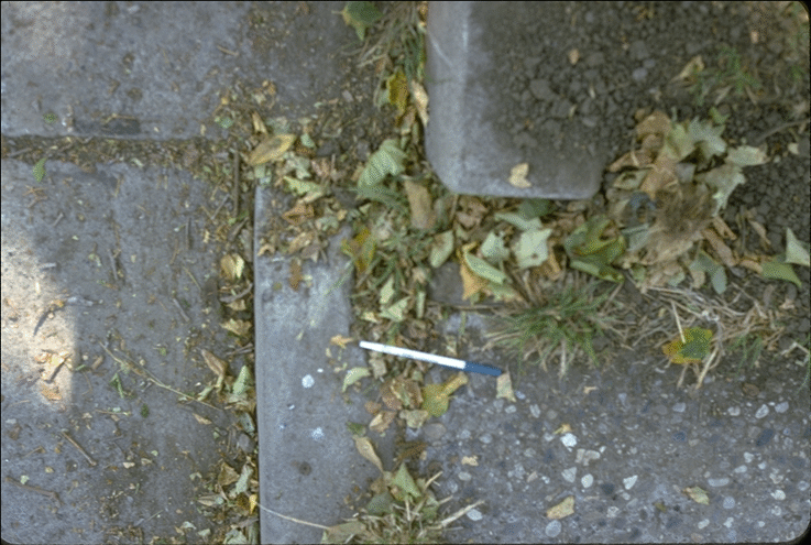 This wall across the street from Dunne Memorial park is quite spectacularly bent. The photo F1 on the left looks East; photo F2 on the right shows the same wall looking West.