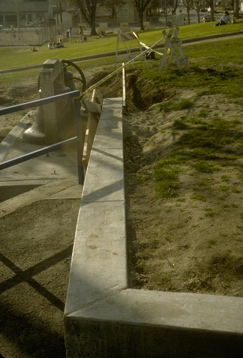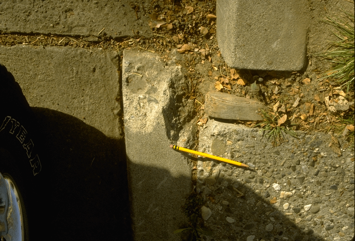 This newly built wall in the park straddles the creeping zone! This photo was taken on February 23, 1991, while the cement was still wet. In twenty years this wall should provide yet another fine example of fault creep.
