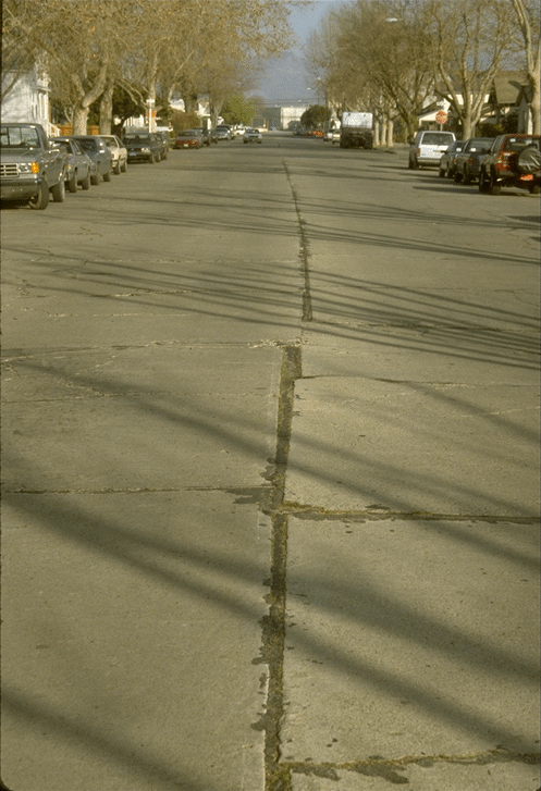 Structures near or straddling the active strand of the fault require new foundations periodically to repair the slow distortion caused by the fault creep. As you walk through Hollister, keep an eye out for subtly distorted buildings.