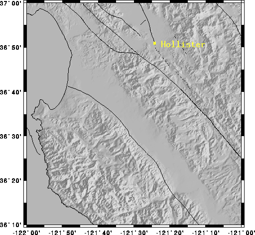 South of the Bay Area the Hayward and Calaveras merge into the San Andreas. Hollister is located just North of where this happens, right on top of the Southern end of the Calaveras fault.