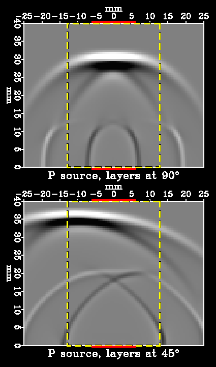 Figure 4: (GIF) (PS) Snapshots showing the behavior of qP-waves in our 90 (top) and 45 (bottom) degree core-sample simulations. The dashed lines show the width of Vernik and Nur's cores; the thick (red) solid lines at the bottom and top show the size and positions of the P-wave source and receiver transducers.