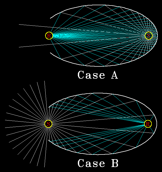 There are two experiments to consider: (A) source at the focus on the enclosed end, and (B) source at the focus on the cut-off end. These two experiments are shown together in Figure 2 , with experiment A on the top and B on the bottom. In each case the source (marked by an S) emits rays evenly in all directions. Each ray can either escape through the hole in the cut-off end, or can reflect from the ellipse and arrive at the receiver (marked by an R).