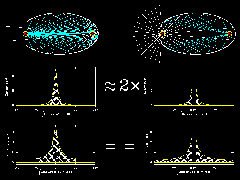 We can now restate the problem. Reciprocity says that the integral of the received wave over the cut sphere in experiment A equals the integral of the received wave over the uncut sphere in experiment B. Observe that the integrand over the uncut sphere is nonzero over almost all angles, whereas the integrand over the cut sphere is nonzero over only half of all angles. This does not necessarily mean that one integral is twice that of the other, because the arriving energy varies with angle. In fact, we know that it is the cut sphere that receives more energy.
