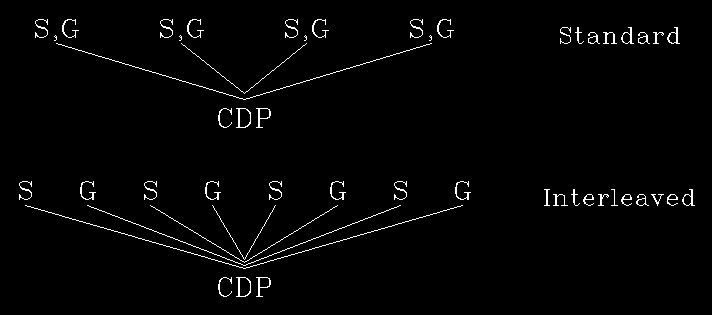 Perhaps the reason is the minor sampling advantage that can be gained by using a slightly different split-spread geometry such as that in the bottom part of Figure 1 . This shooting geometry has an advantage over an off-end geometry with the same number of geophones because for the off-end case CDP gather geometries vary with midpoint. This advantage of split spread over off end must be balanced against the additional cost of having twice as much wire out on the ground. Note that in the split-spread geometry shown here the reciprocity principle is implicitly invoked, because traces shot in opposite directions are interleaved in the gather.