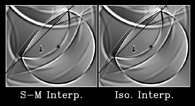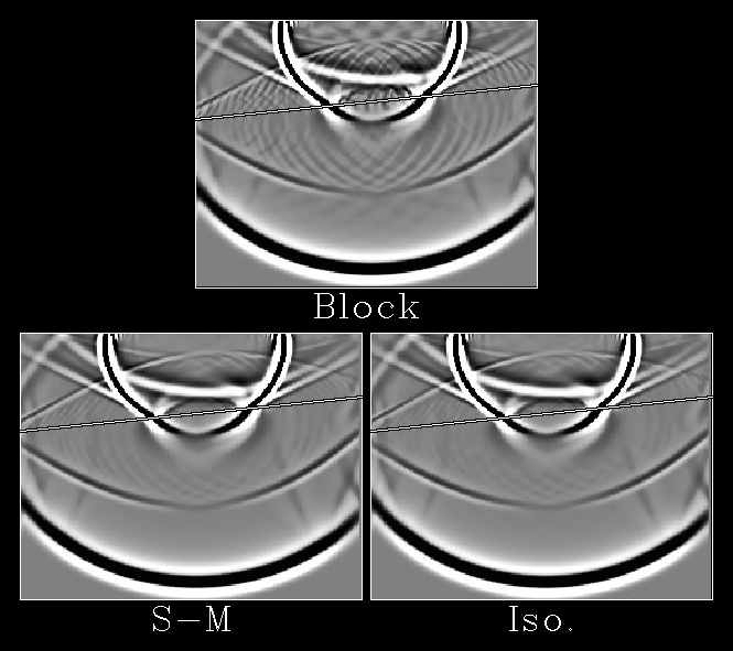 The top part of Figure 2 shows the results if we follow the usual practice and fit a best-approximating set of stair steps to the interface. The step every 10 horizontal gridpoints causes very noticeable diffractions in the scattered wavefield. The lower left part of Figure 2 shows the same example using our Schoenberg-Muir averaging scheme. The S-M model nearly eliminates the stair-step scattering. The lower right part of Figure 2 shows the same example again, this time using isotropic slowness averaging. This method reduces the stair-step scattering almost as well as the S-M interpolation method.