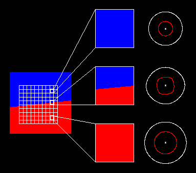 The top highlighted cell is entirely within the top medium. Its elastic constants are therefore the same as that of the top (light-shaded) homogeneous medium. To the right of the blown-up cell we show the isotropic P-SV impulse response for this medium. The bottom highlighted cell is entirely in the lower medium, and so its elastic constants are the same as that of the lower (dark-shaded) homogeneous medium. Again, to the right we show the isotropic P-SV impulse response. The middle highlighted cell is the interesting one, since it contains a mixture of both media. Intuitively, the elastic constants for this cell should be some sort of average of the top and bottom media. The question is, what sort of averaging is best?