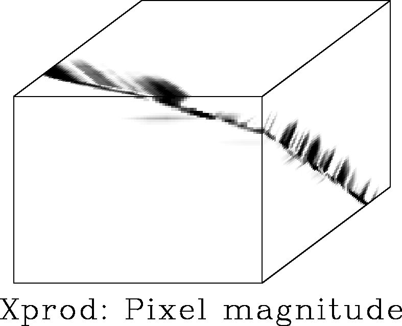 The magnitude of the residuals of the synthetic image example (Figure 26) resembles its constituent components (Figure 25). Patches that contain pure plane waves are zeroed. Patches that straddle the fault and contain two plane waves of distinct dip show significant residual amplitudes. The limit of resolution of the operator is the patch and, again, the fault is broadly outlined but not pinpointed. The discontinuity amplitude does not have a simple interpretation, except that it indicates plane-wave elements that are not well approximated by the somewhat arbitrary best-fitting local plane wave. Interestingly, the generally lower amplitudes of the horizontal plane-wave region indicate that the the best-fitting local plane waves tend to approximate the horizontal events better than the dipping ones. The side of the local cubic patch is 12 pixels long; the side of the total input cube is 80 pixels long.