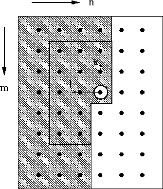 the prediction error is simply .The region Sx defines which neighboring values contribute to the linear prediction. Causal predictions, that involve regions of the shape shown in Figure 35, lead to white noise driven output images. The region is called causal since given a hypothetical scan from top to bottom and left to right all points of Sx lie to one-side of the predicted value u(m,n).