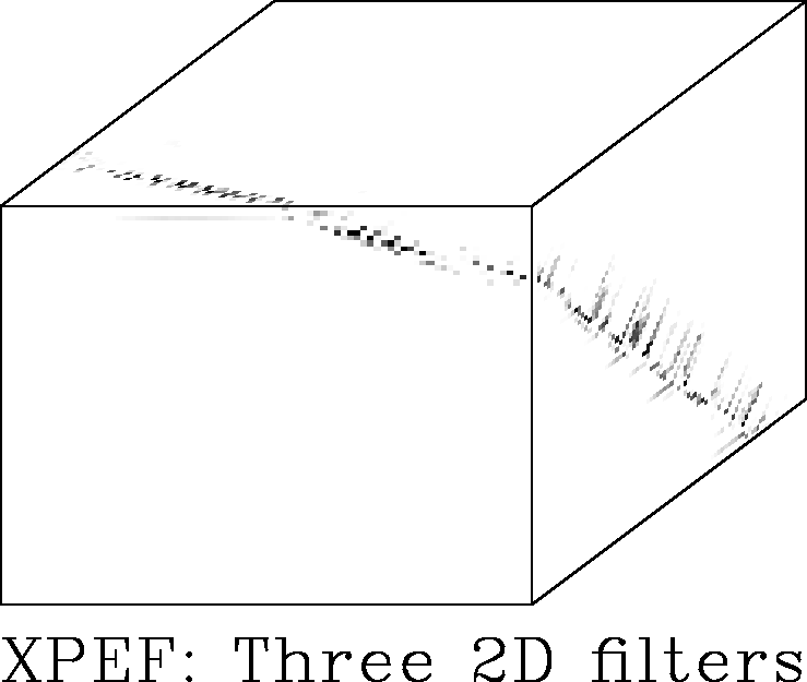 Figure 43 Forward and adjoint of three 2-D prediction-error filters applied to synthetic test case. The output delineates the fault, but surrounds it with some blur. | ![]() |